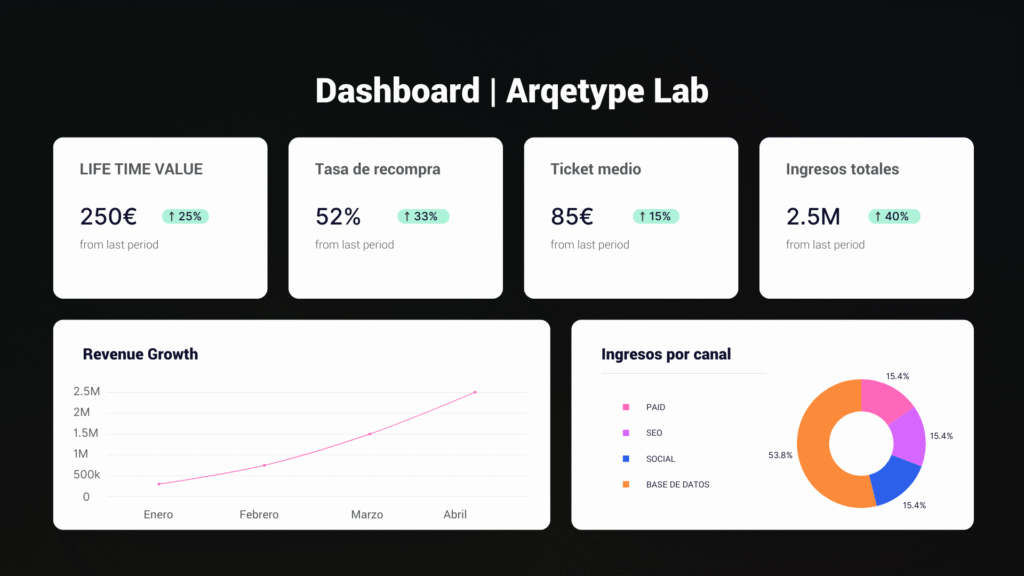 Tienes en un solo dashboard el LTV por cohorte, la tasa de recompra, los ingresos de cada sistema, el rendimiento de cada flujo y las alertas cuando algo se desvía, todo actualizado al minuto. Dejas de perseguir reportes mensuales y de cruzar excels para "intuir" que pasa, y empiezas a ajustar campañas, ofertas y sistemas con datos frescos, reaccionando en días, no en trimestres.